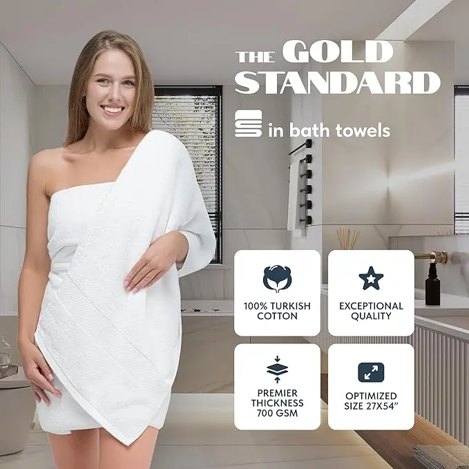 Optimal Size and Plush Softness: Delight in the lavishness of our 27 x 54-inch white bathroom towels large, expertly made from the finest 700 GSM long-staple 100% combed cotton, elevating your bathing experience to a new level of luxury